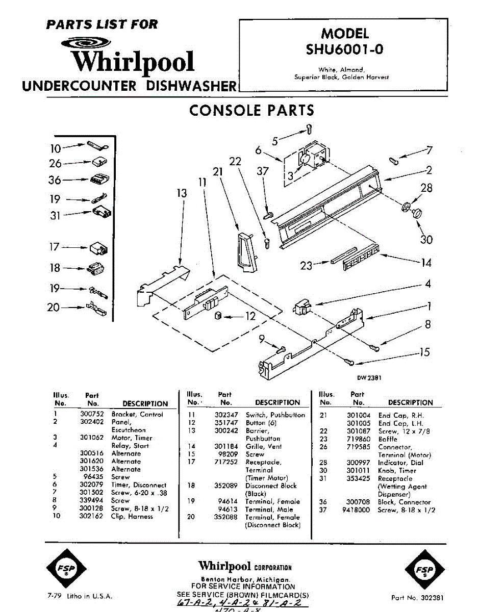 Parts for Whirlpool SHU60010: 01 - Console Parts