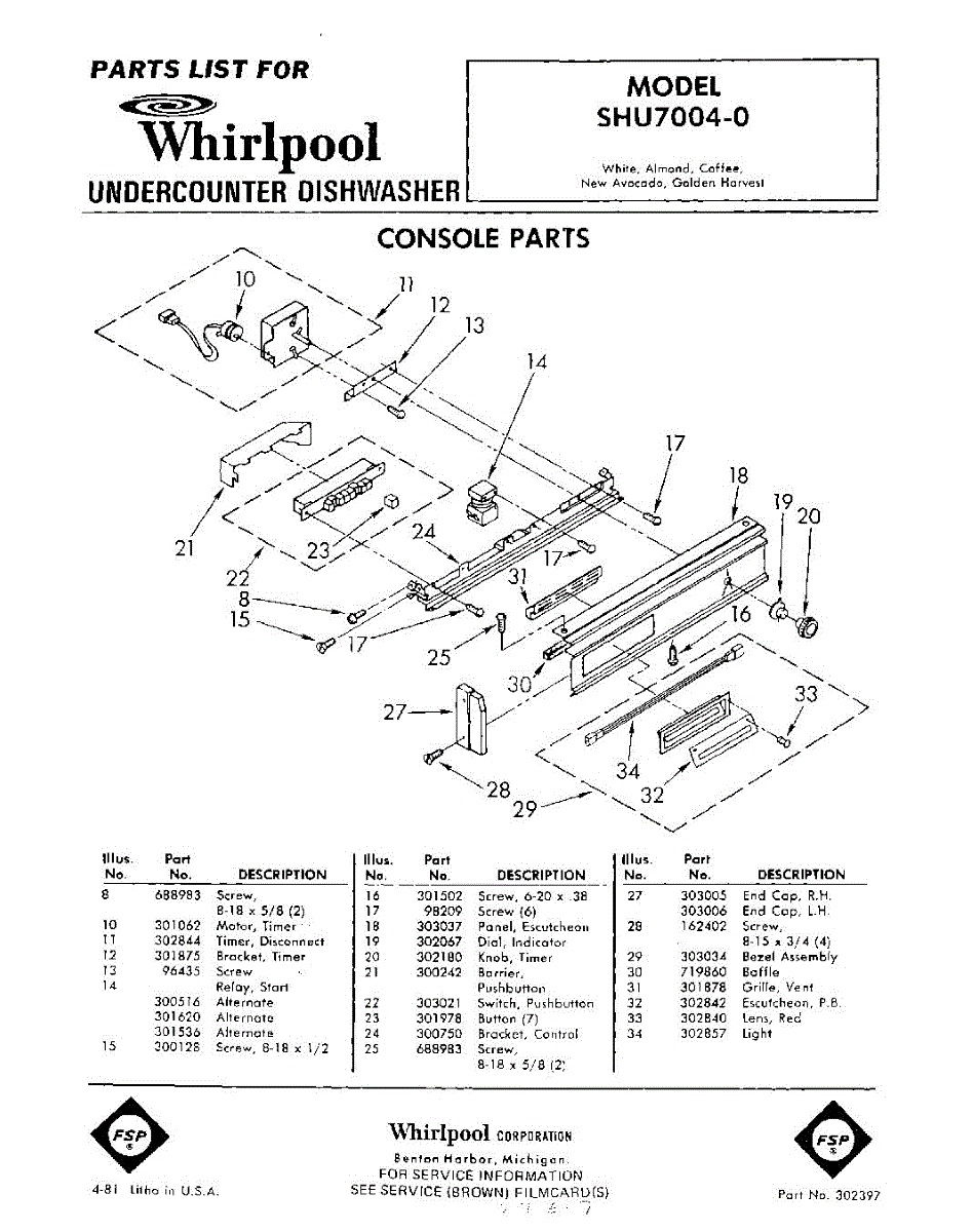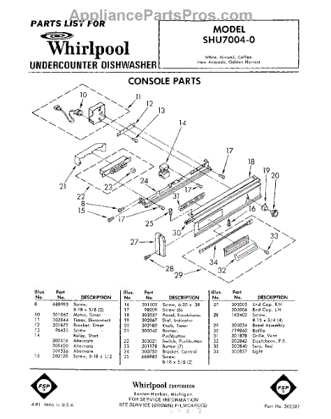 Parts for Whirlpool SHU70040: 01 - Console Parts