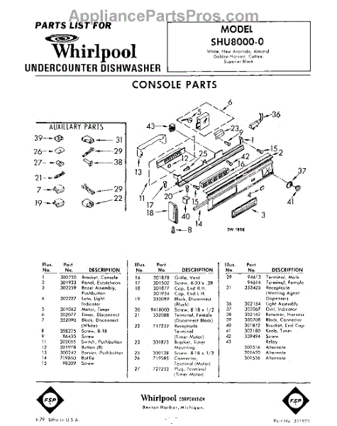 Parts for Whirlpool SHU80000: 01 - Console Parts