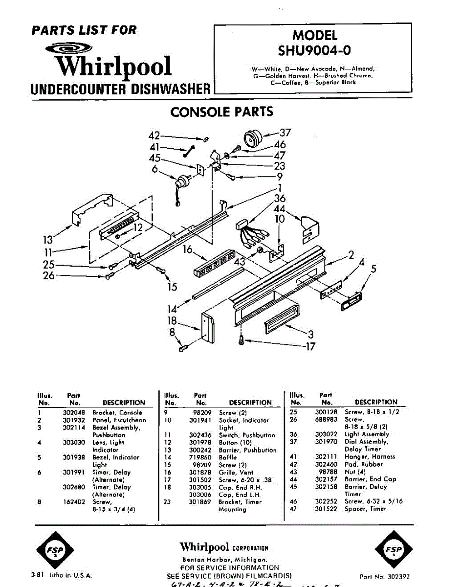 Parts for Whirlpool SHU90040: 01 - Console Parts