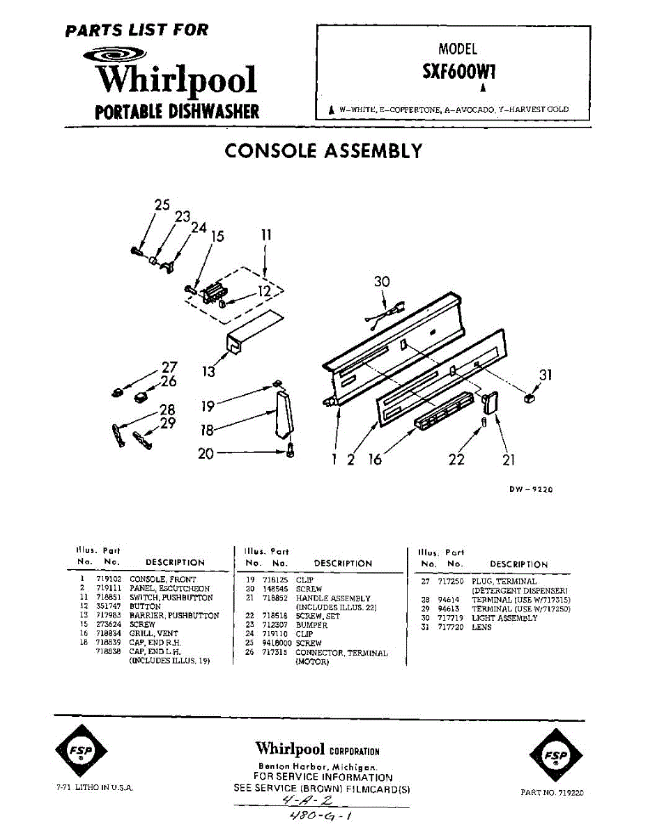 Parts for Whirlpool SXF600W1: 01 - Console Parts