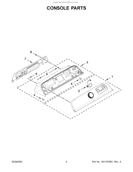 The Console Clip is an OEM part compatible with Whirlpool dryers. This clip secures the control console assembly to the top panel, ensuring it is firmly mounted during operation. Properly functioning clips are necessary to maintain the correct alignment of controls and prevent detachment.