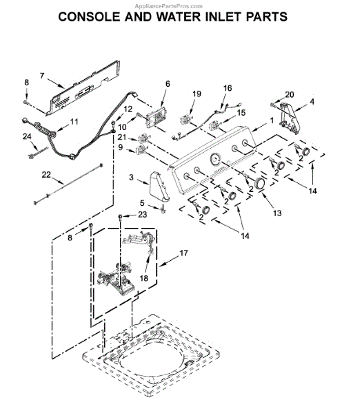 This control panel is the user interface assembly that lets you select cycles, start and stop the appliance, and view status indicators. It replaces a worn or unresponsive console to restore normal control and feedback. What it does: