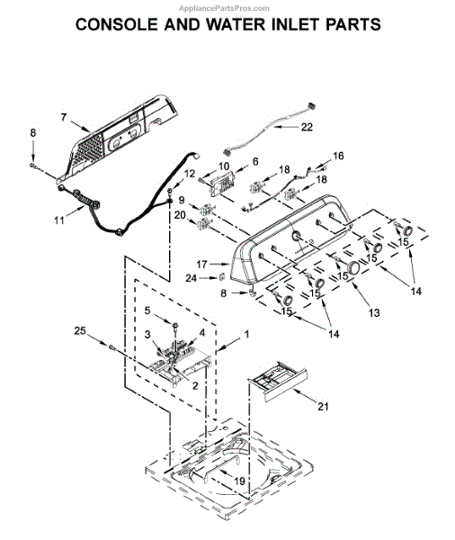 The Dispenser Housing is an OEM part for Whirlpool washing machines. It is the outer casing that surrounds and protects the internal dispenser mechanism and water inlet valves. It also features openings to allow for the dispensing of laundry detergent and other additives at just the right times during the wash cycle.