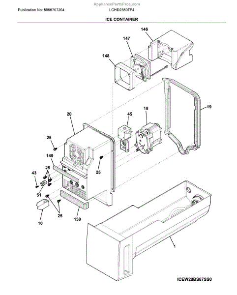This OEM replacement part is an ice container for refrigerators. The ice container is the plastic bucket that holds the ice that is made by the icemaker. Over time, an ice container can become damaged due to excessive wear and tear. If the ice container is cracked or broken to the point where it can no longer hold ice, it will need to be replaced.To replace the ice container, start by unplugging the refrigerator. Once unplugged, proceed to open the freezer door. Locate the two mounting screws that attach the ice container to the icemaker. Once found, proceed to unthread the screws to remove the old container. After pulling the old container out, slide the new one in place and fasten the mounting screws that secure it to the icemaker. This genuine replacement part is sourced directly from the manufacturer and is sold individually. It is compatible with Frigidaire, Electrolux, Gibson, Kelvinator, and Westinghouse brand refrigerators.