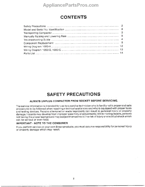 Parts for Broan 1050: Contents / Safety Precautions Parts