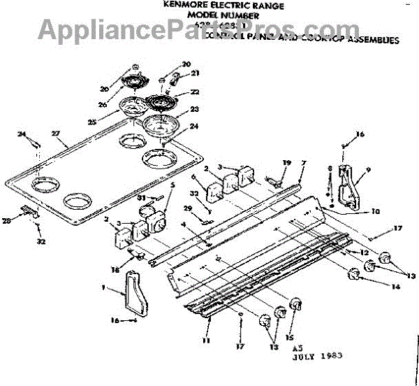Parts for Kenmore 628.6628311 (6286628311, 628 6628311): Control Panel And Cooktop Assemblies Parts