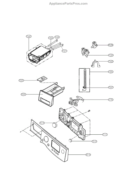The Pump Hose is an OEM replacement part for LG washing machines. It is a flexible tube that connects the pump assembly to the internal tub and spins through the detergent dispenser area. The pump hose is responsible for circulating and removing water during the wash and rinse cycles.