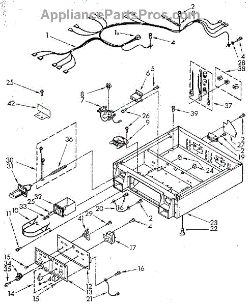 Bracket extension for dryers and laundry centers. Mounts to provide structural support for internal components. Replace if bent, broken, or missing.