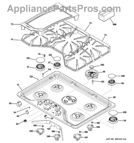 Tri-ring burner assembly for GE gas cooktops. Includes three burners, grates, and brackets. Replace if cracked, warped, bent, or damaged from heat or impact.
