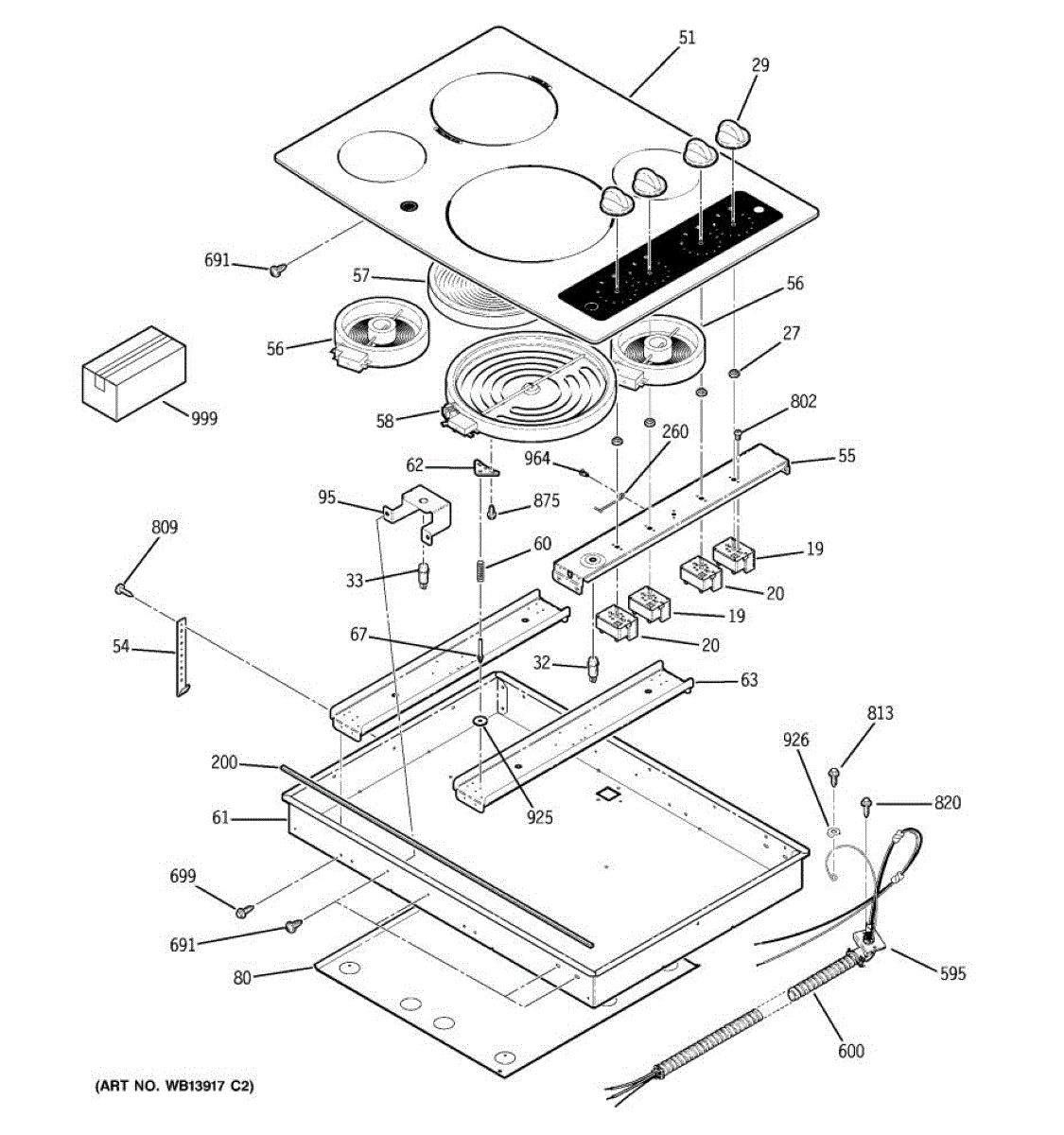 Glass top assembly for cooktop surfaces. Replaces cracked, chipped, or broken glass cooktop panels. Restores the smooth cooking surface appearance.