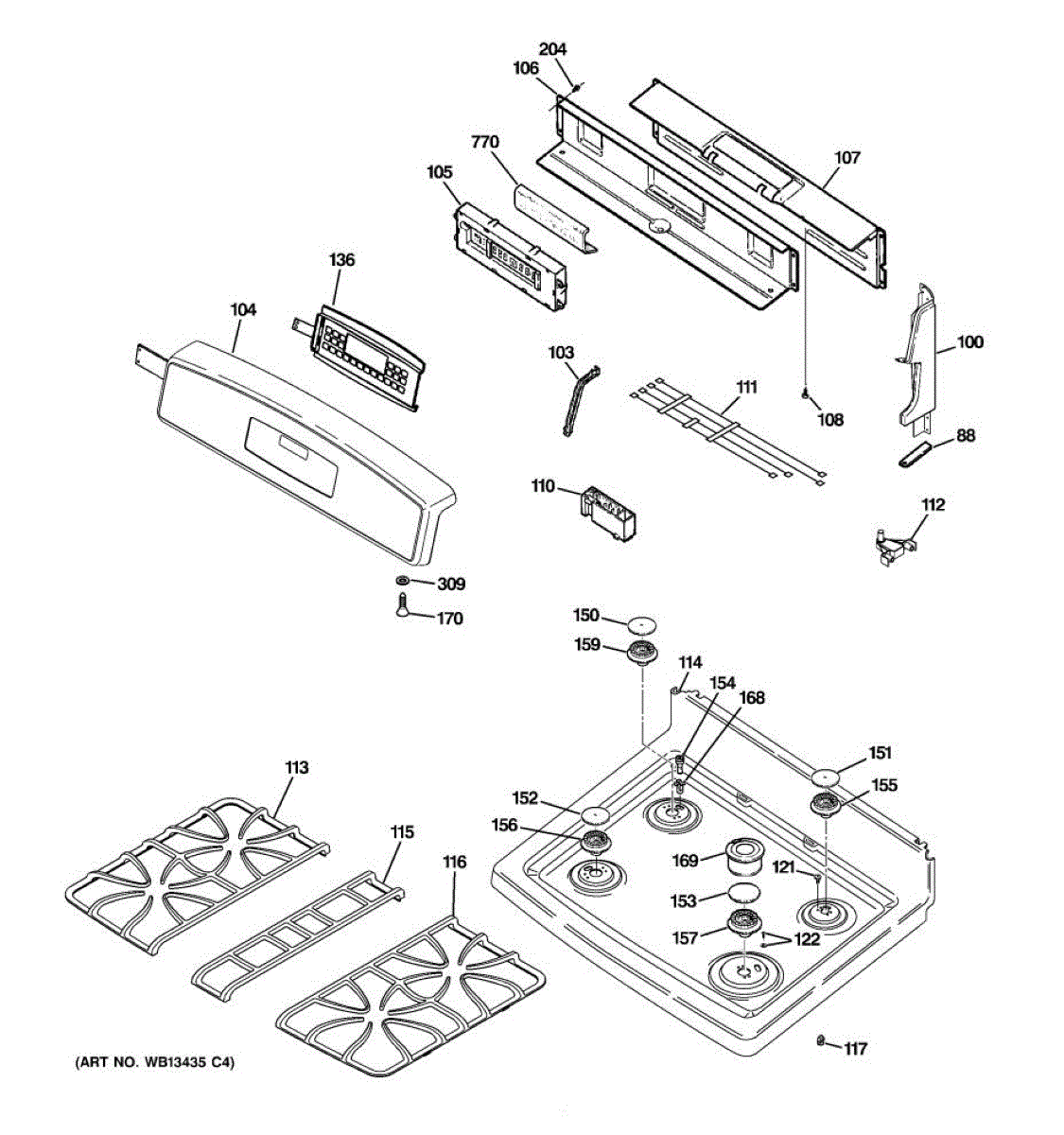 Cast cooktop grate provides stable support for pots and pans over burners. Replace this surface grate when cracked, chipped, or damaged from heavy use.