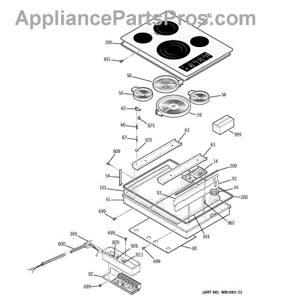 Distributes power to control and heating circuits. Replace when board is damaged, failed, or non-responsive. Installs at bottom of cooktop unit.