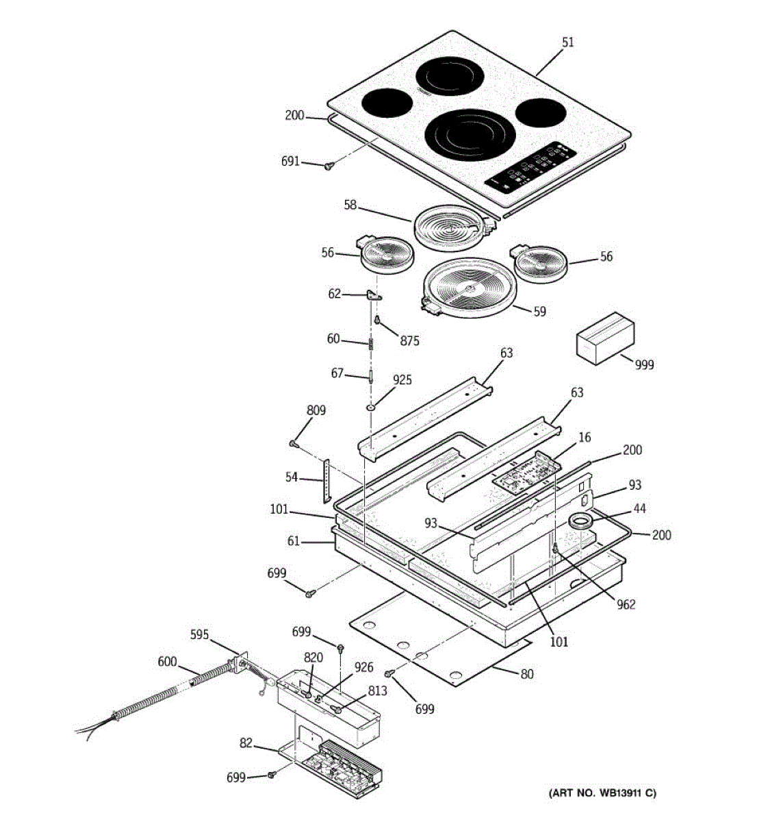 Distributes power to control and heating circuits. Replace when board is damaged, failed, or non-responsive. Installs at bottom of cooktop unit.