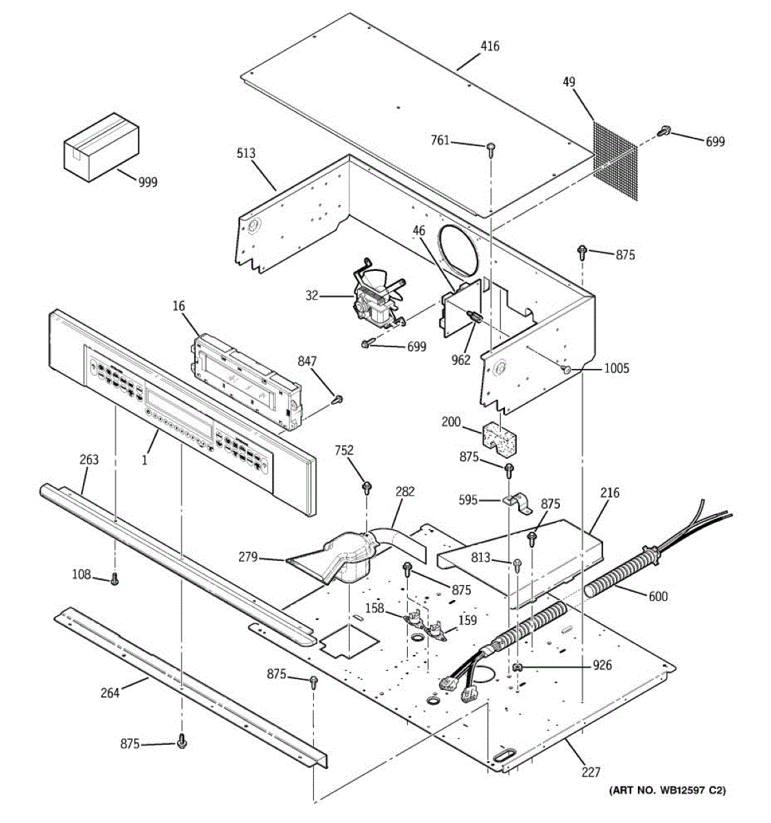 Oven vent box assembly that routes hot air and steam from the cooking cavity. Replace if cracked, damaged, or missing to restore proper ventilation.