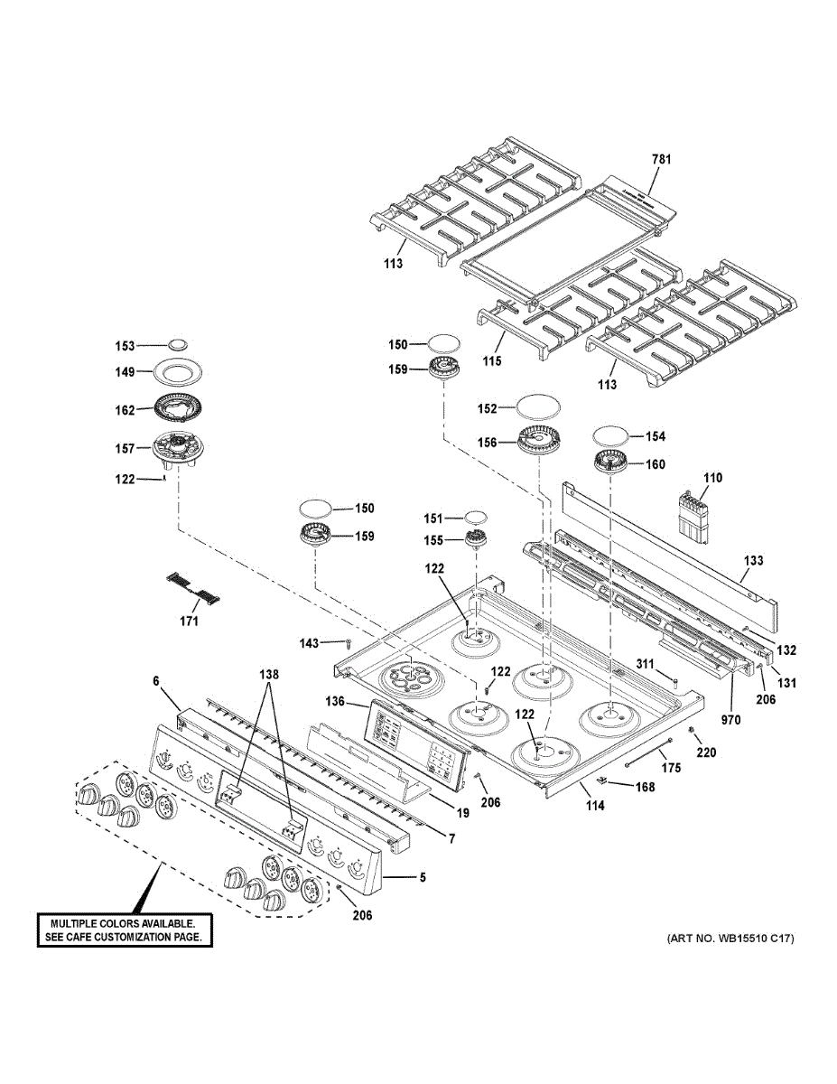 Burner cap assembly covers the burner head on gas cooktops and ranges. Replace cracked, stained, corroded, or missing caps to restore appearance.