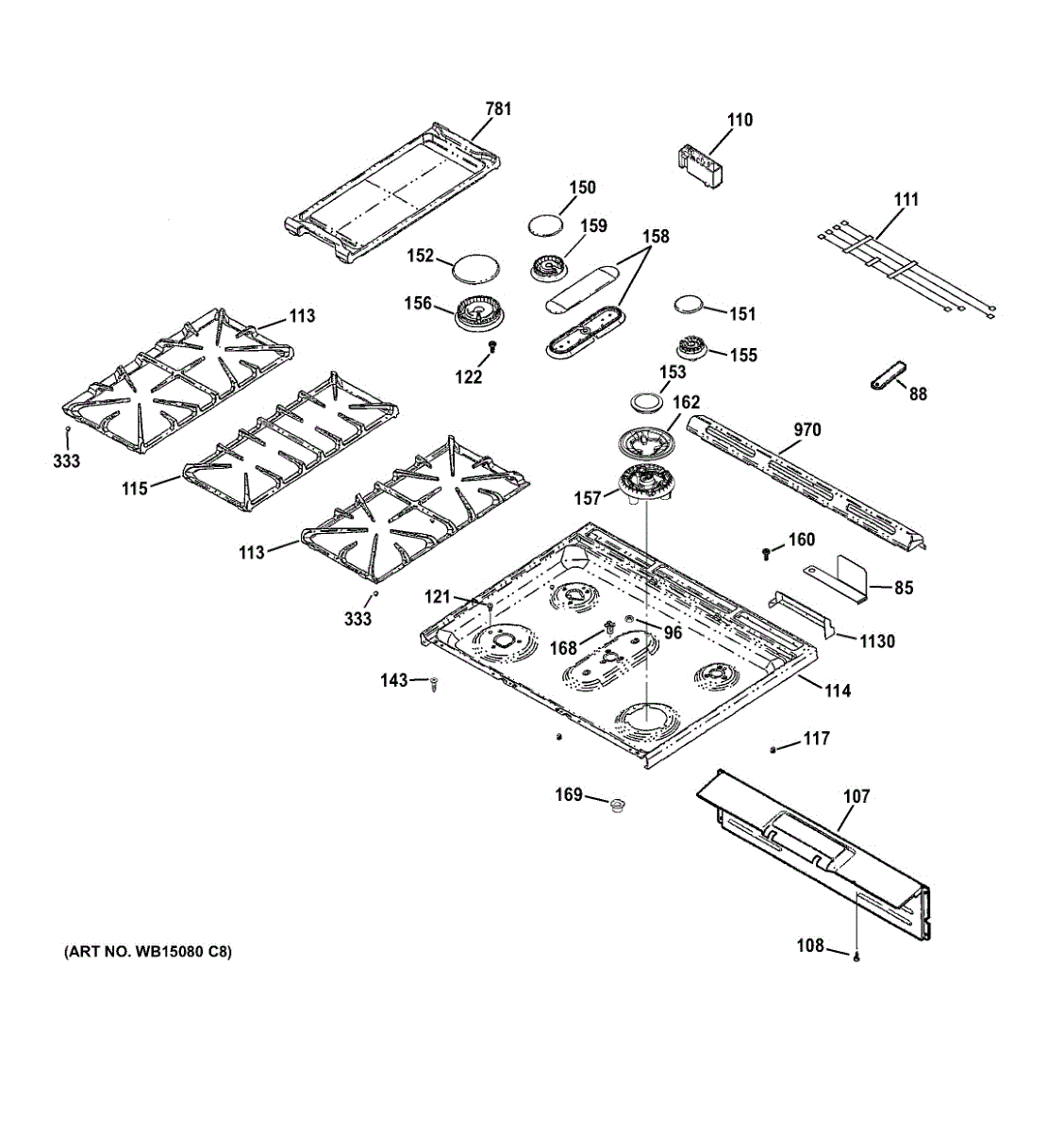 Tri-ring burner assembly for GE gas cooktops. Includes three burners, grates, and brackets. Replace if cracked, warped, bent, or damaged from heat or impact.