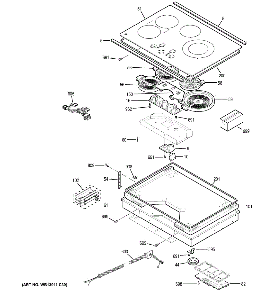 Replace a faulty cooktop wire harness when control panel buttons don't respond or burners won't turn on. Connects control board to sensors and switches.