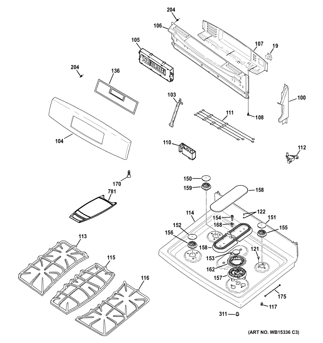 Tri-ring burner assembly for GE gas cooktops. Includes three burners, grates, and brackets. Replace if cracked, warped, bent, or damaged from heat or impact.