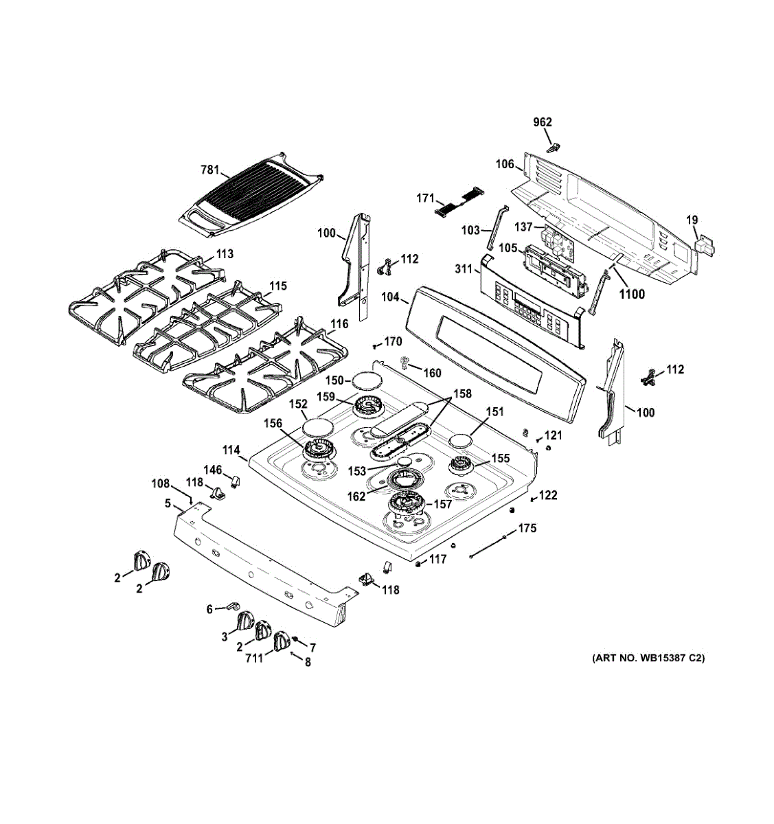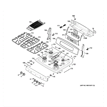 Tri-ring burner assembly for GE gas cooktops. Includes three burners, grates, and brackets. Replace if cracked, warped, bent, or damaged from heat or impact.