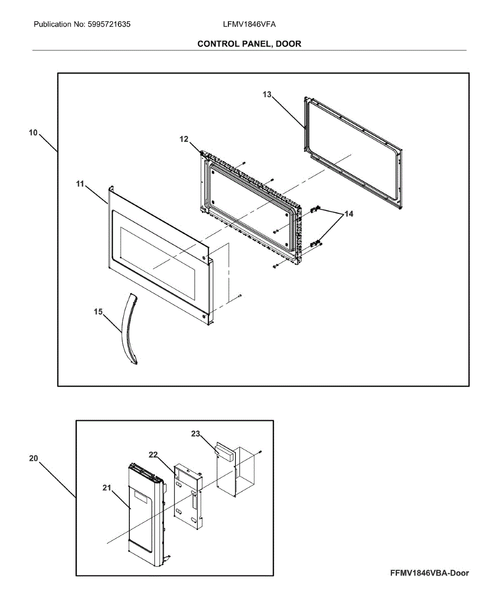 Complete door assembly for microwave/hood combo units. Replacement for damaged, cracked, or broken doors. Includes window, handle, and hinges in one unit.