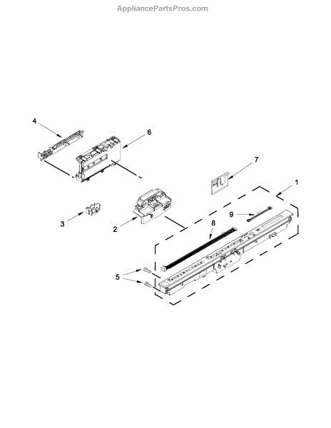 Structural mounting brace for dishwashers. Secures dishwasher to cabinetry. Replace if bent, cracked, or missing to restore proper installation.