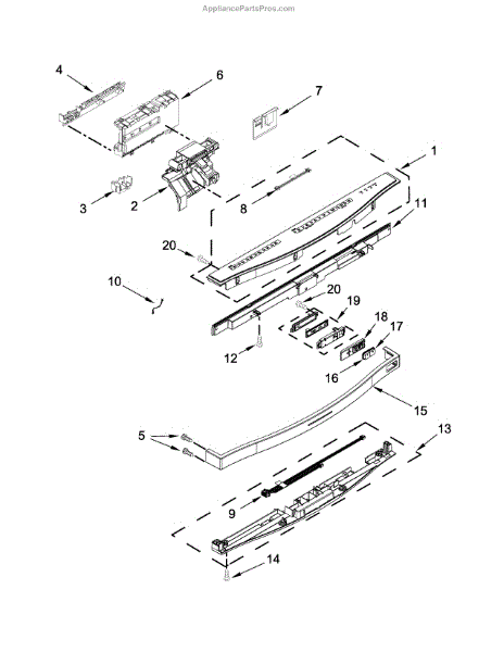 Structural mounting brace for dishwashers. Secures dishwasher to cabinetry. Replace if bent, cracked, or missing to restore proper installation.