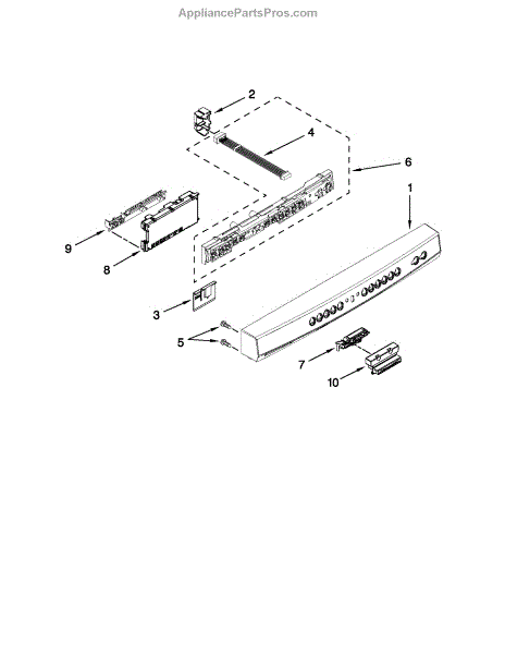 Replaces cracked or damaged dishwasher control panel housing. Protects user interface and provides secure mounting for buttons and display.