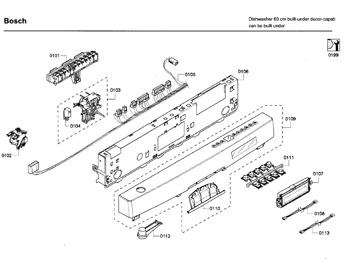 Cable harness for dishwasher door control panel. Replaces damaged, frayed, or corroded wiring harness. Restores electrical connections between components.