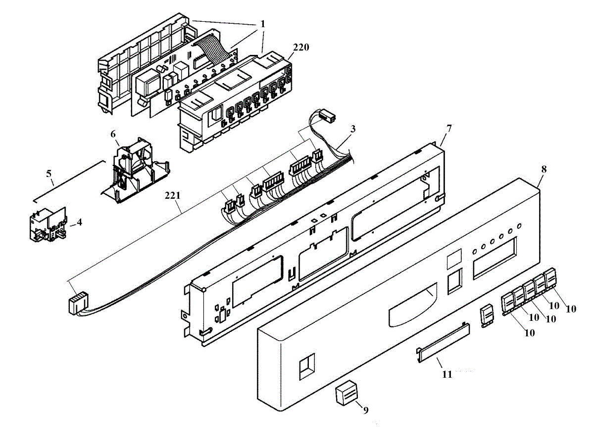 Wire harness for dishwasher fascia panel. Connects control panel electronics to main system. Replace if wires are frayed, damaged, or connector broken.