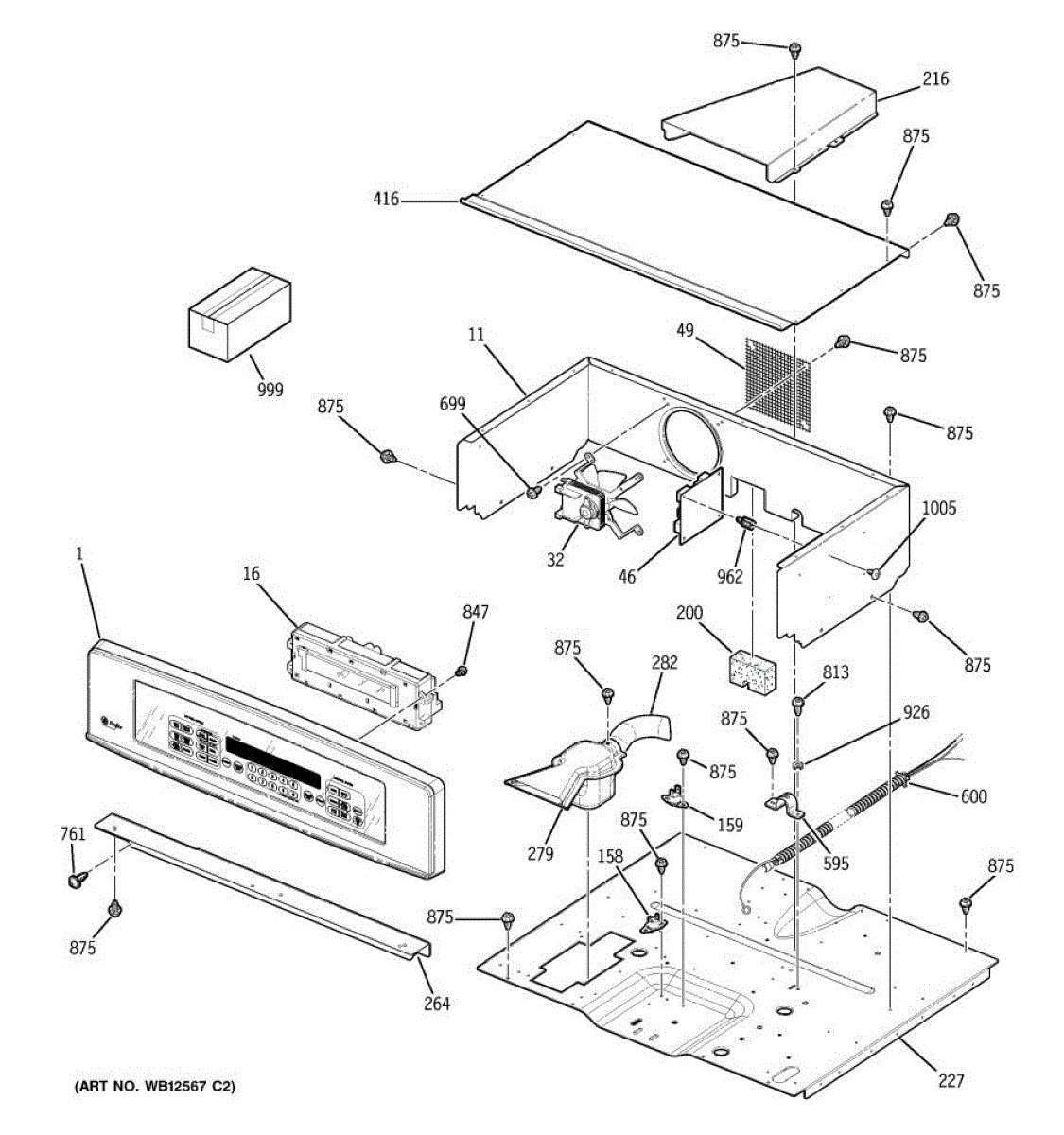 This control cooling fan assembly circulates air through the oven's control compartment to remove heat. By keeping the console and electronics cool during and after cooking, it helps prevent overheating and protects sensitive components.