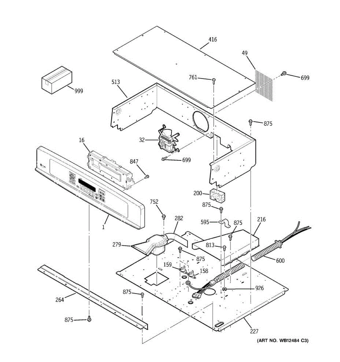 Oven vent box assembly that routes hot air and steam from the cooking cavity. Replace if cracked, damaged, or missing to restore proper ventilation.