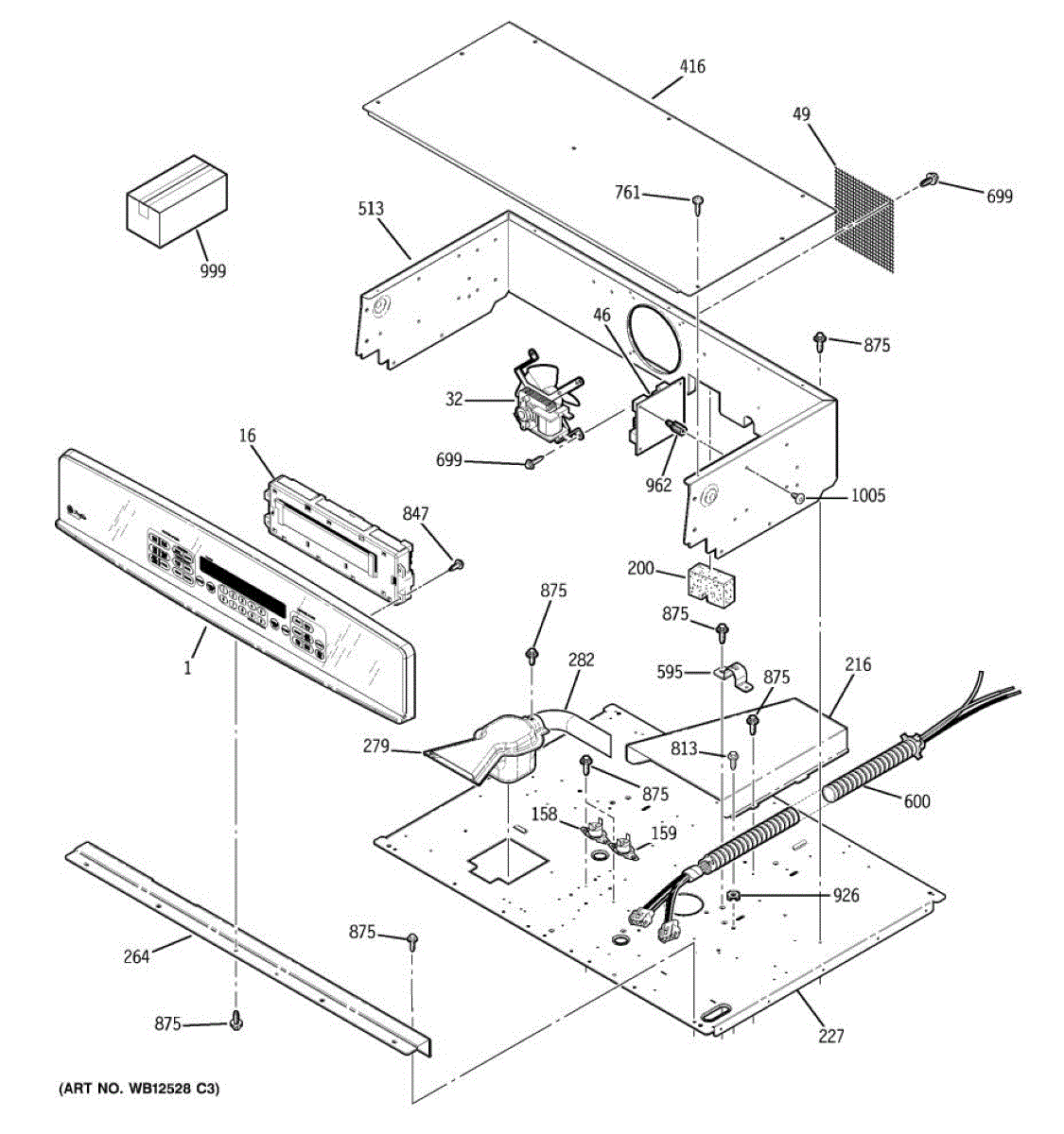 Oven vent box assembly that routes hot air and steam from the cooking cavity. Replace if cracked, damaged, or missing to restore proper ventilation.