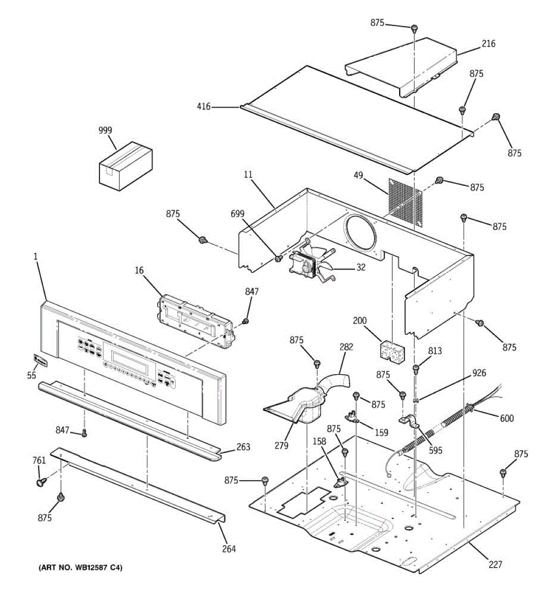 Oven vent box assembly that routes hot air and steam from the cooking cavity. Replace if cracked, damaged, or missing to restore proper ventilation.