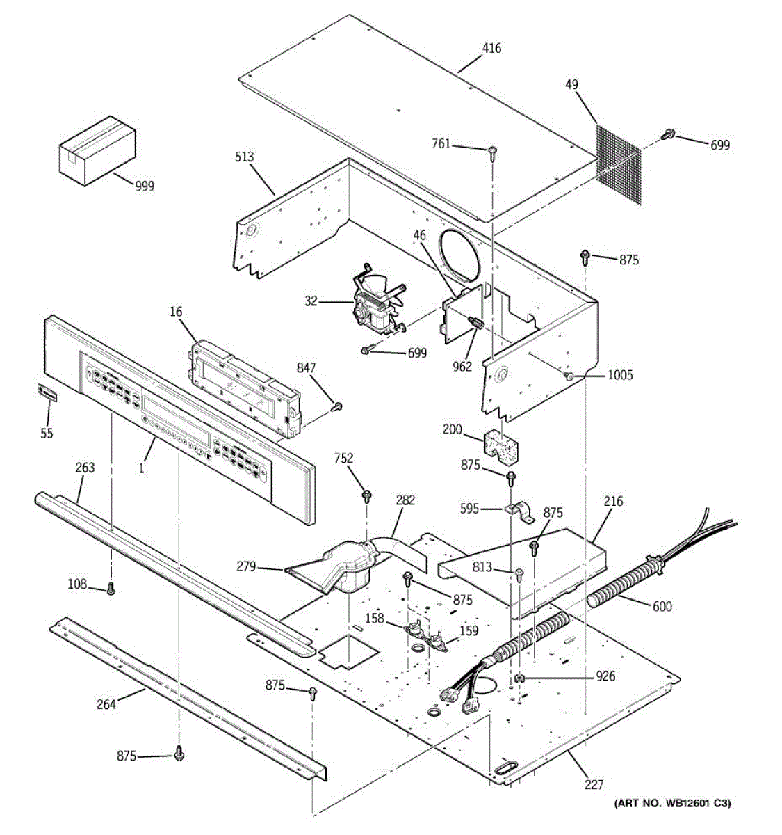 Oven vent box assembly that routes hot air and steam from the cooking cavity. Replace if cracked, damaged, or missing to restore proper ventilation.
