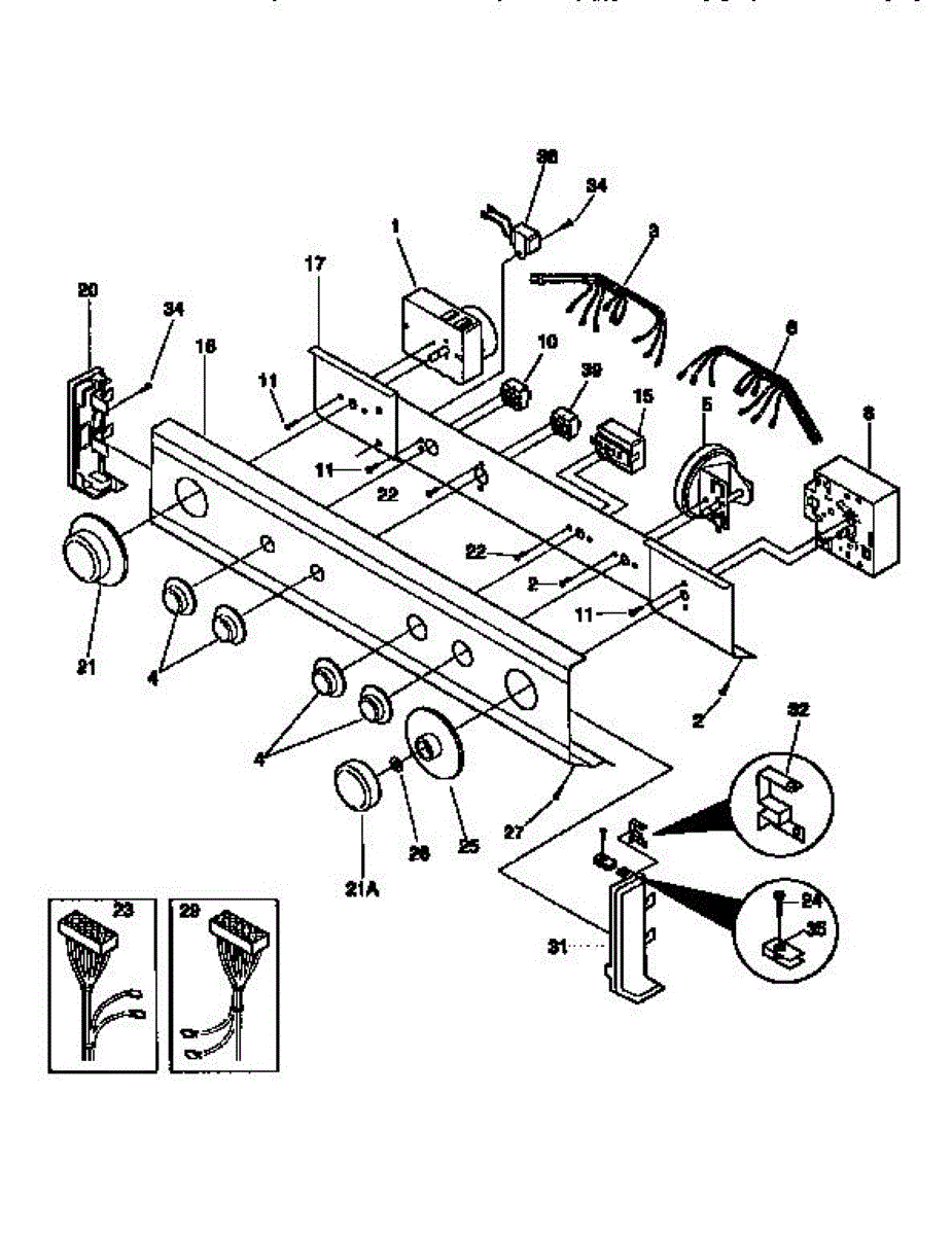 Control wiring harness for washer dryer combo units. Connects control panel to internal components. Replace if wires are frayed, damaged, or connector clips are broken.