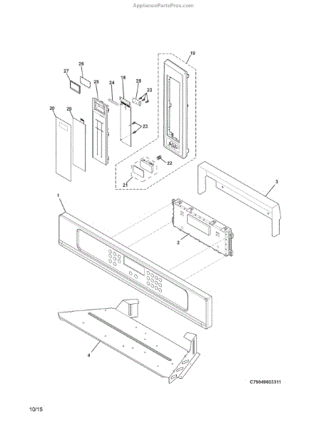 Control panel assembly for wall ovens. Installs on the front face to house buttons and display. Replace if cracked, damaged, or cosmetically worn.