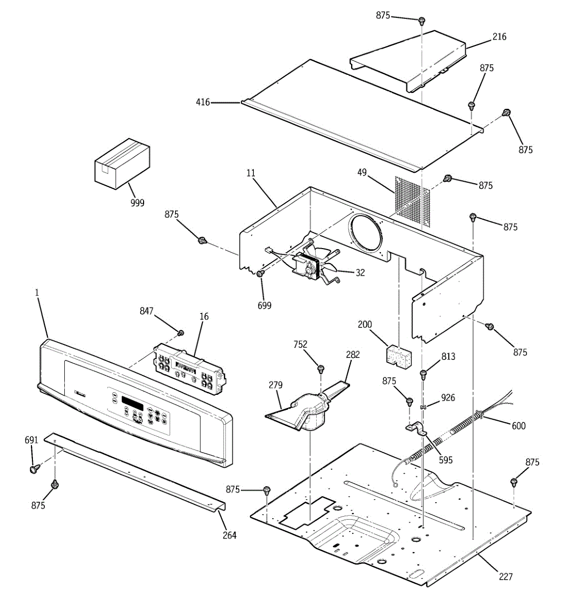Oven vent box assembly that routes hot air and steam from the cooking cavity. Replace if cracked, damaged, or missing to restore proper ventilation.