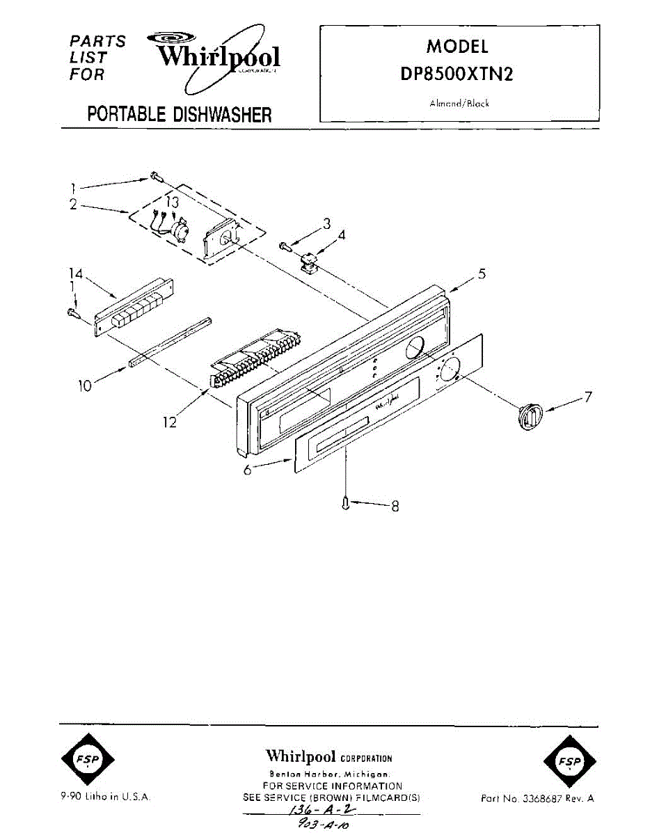 Parts for Whirlpool DP8500XTN2: 01 - Control Panel Parts