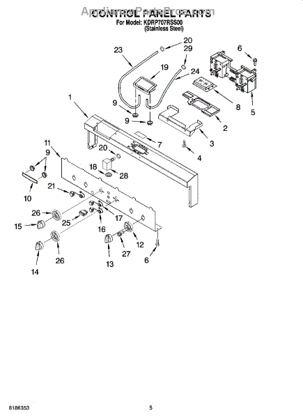 This factory screw secures appliance components to their mounting points. Replace missing, worn, or stripped hardware to restore a tight fit, proper alignment, and quieter operation across the affected assembly.