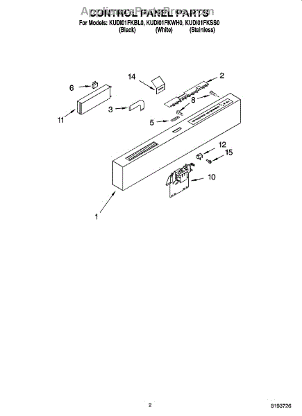 This touch pad control panel mounts on the dishwasher door, housing the buttons for cycle selection. Replace when buttons are worn, unresponsive, or cracked.