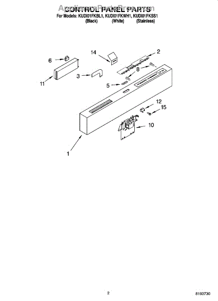 This touch pad control panel mounts on the dishwasher door, housing the buttons for cycle selection. Replace when buttons are worn, unresponsive, or cracked.