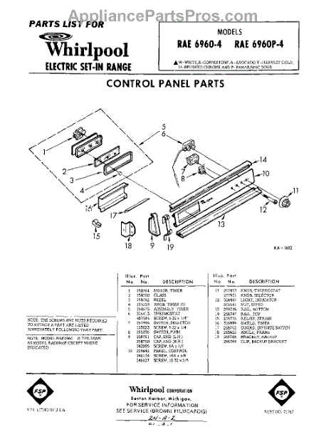 Parts for Whirlpool RAE69604: 01 - Control Panel Parts
