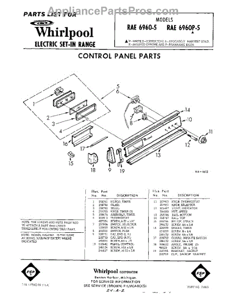 Parts for Whirlpool RAE69605: 01 - Control Panel Parts