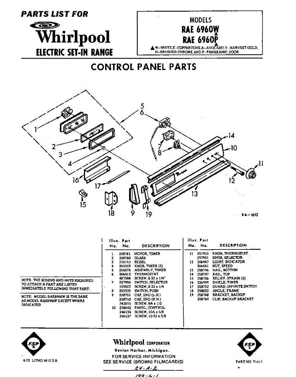 Parts for Whirlpool RAE6960W: 01 - Control Panel Parts
