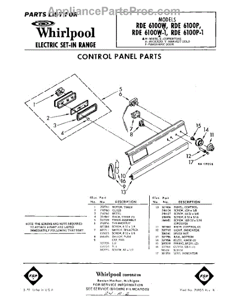 Parts for Whirlpool RDE6100W: 01 - Control Panel Parts