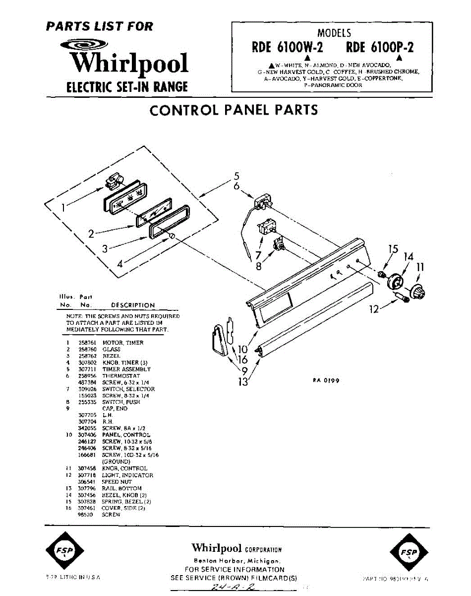 Parts for Whirlpool RDE6100W2: 01 - Control Panel Parts