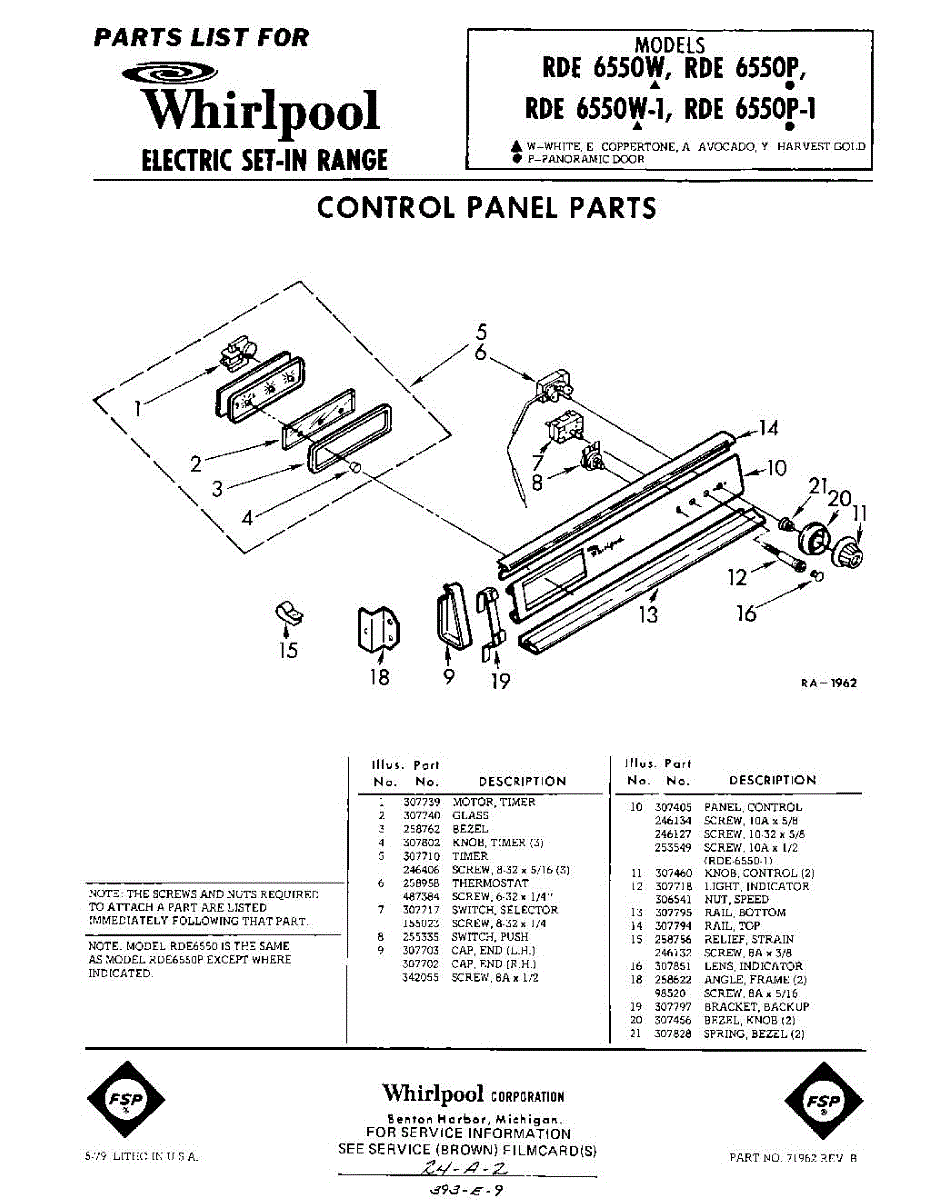 Parts for Whirlpool RDE6550W: 01 - Control Panel Parts