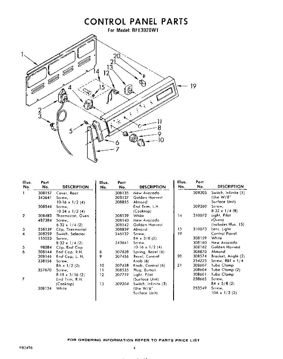 Parts for Whirlpool RFE3020W1: 04 - Control Panel Parts