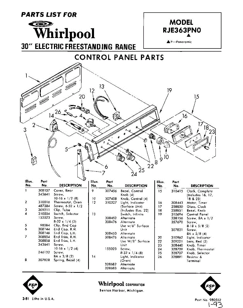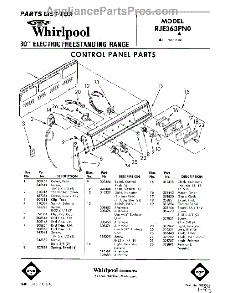 Parts for Whirlpool RJE363PN0: 01 - Control Panel Parts